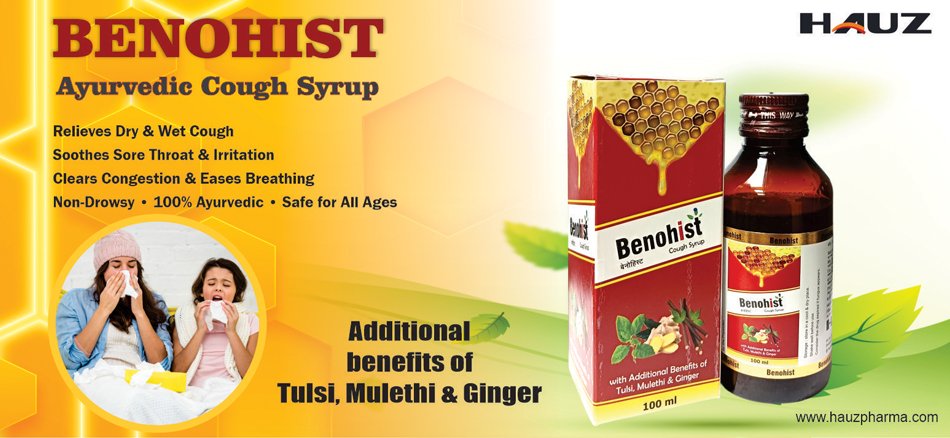 🌿 When cough and cold strike, they don’t just affect your throat – they drain your energy, comfort, and focus. Instead of turning to harsh, chemical-based syrups, choose the healing touch of nature. Introducing HAUZ-Benohist, a 100% Ayurvedic cough syrup carefully crafted to bring you fast, natural, and long-lasting relief — without any side effects.