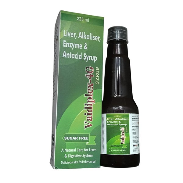 Vaidiplex-4G Syrup is a multi-action formulation designed to support liver health, improve digestion, and provide relief from acidity, as advised by a doctor. It works as a liver tonic, alkalizer, digestive enzyme, and antacid, helping to maintain overall digestive balance. This syrup is commonly used to relieve symptoms like indigestion, bloating, gas, and acid reflux while supporting liver function and detoxification. Regular use may help enhance appetite, improve metabolism, and promote gastrointestinal comfort. Vaidiplex-4G Syrup should be taken under medical guidance for safe and effective results.