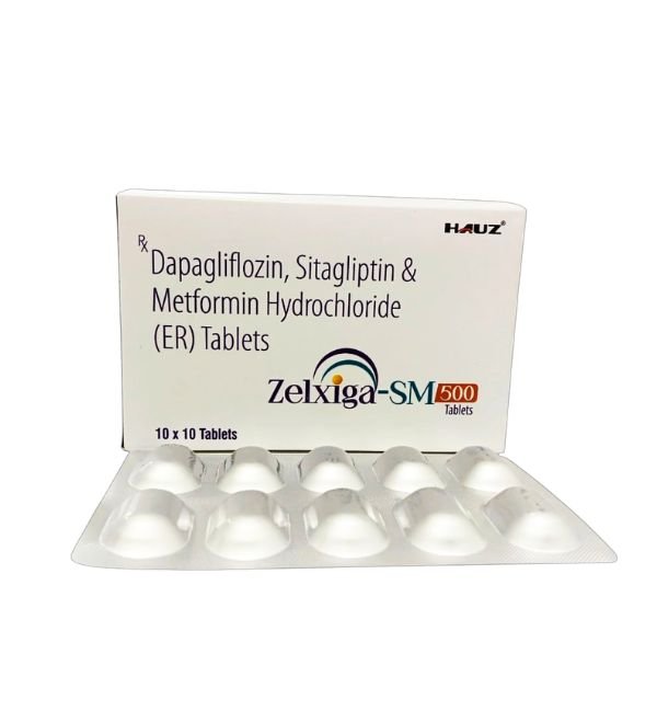 Zelxiga‑SM 500 is used to manage Type 2 Diabetes by helping control blood sugar levels. It combines Dapagliflozin, which removes excess glucose through urine, Sitagliptin, which increases insulin release and reduces post-meal glucose, and Metformin ER, which lowers glucose production in the liver and improves insulin sensitivity, providing effective overall glycemic control. This medicine should be taken only as prescribed by a doctor, along with a healthy diet, regular exercise, and routine blood sugar monitoring for safe and effective diabetes management.